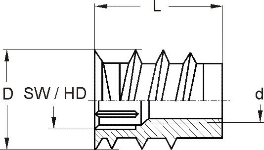 RAMPA-Muffen Typ SKD30L mit abschließendem Bund, Innensechskant, Führungsansatz und mit patentiertem 1-Gang-Außengewinde linksgedreht für vereinfachtes Einschrauben mit besonderen Anforderungen in Holz, Holzwerkstoffen und thermoplastischen Kunststoffen. Verhindert das Losdrehen bei häufigen Schraubanwendungen und hohen Reibwerten.