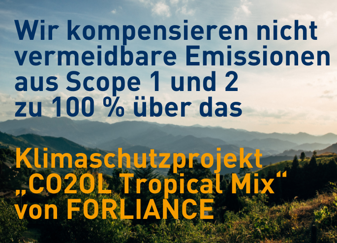 Für Emissionen, die wir aktuell nicht vermeiden können, haben wir uns dazu entschlossen Investments in qualitativ hochwertige Klimaschutzprojekte, vorzugsweise solche, die Kohlenstoff langfristig aus der Atmosphäre entziehen und in natürlichen Systemen einlagern, zu tätigen. Die verursachten CO₂-Emissionen in den Scopes 1 und 2 kompensieren wir zu 100 % durch eine Investition in das Klimaschutzprojekt durch eine Investition in das Klimaschutzprojekt „CO₂OL Tropical Mix“ von FORLIANCE. Langfristig arbeiten wir daran, die kompensierten Emissionen weiter zu reduzieren.