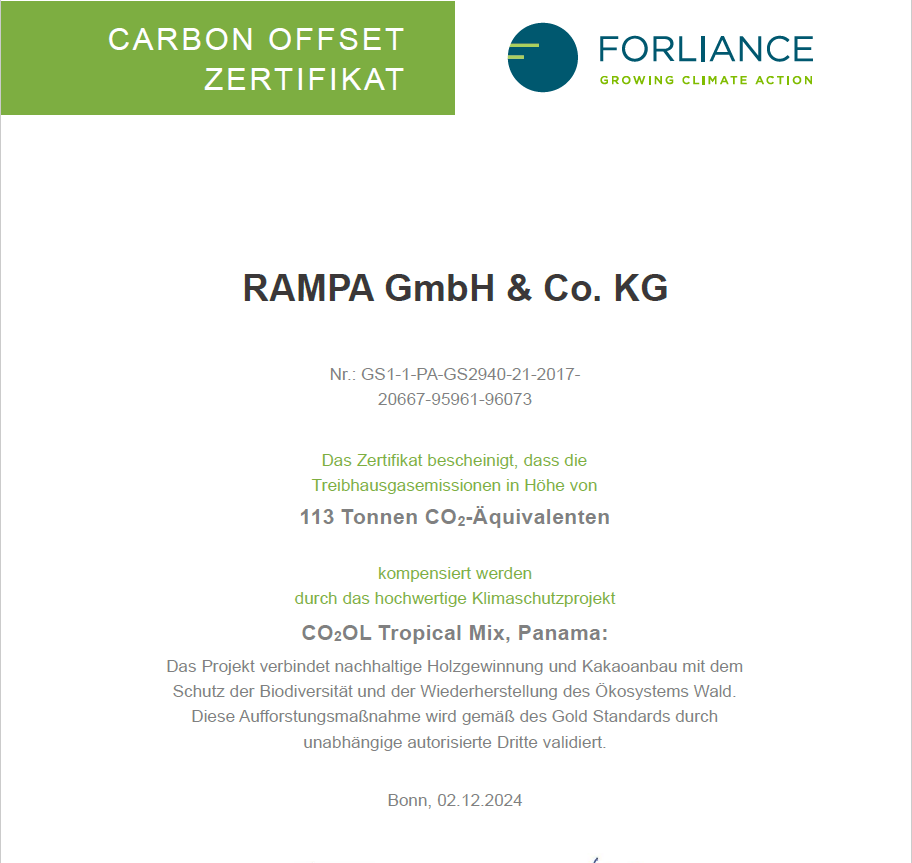 RAMPAs nicht vermeidbare Treibhausgasemissionen aus Scope 1 und 2 wurden komplett wie folgt kompensiert:
