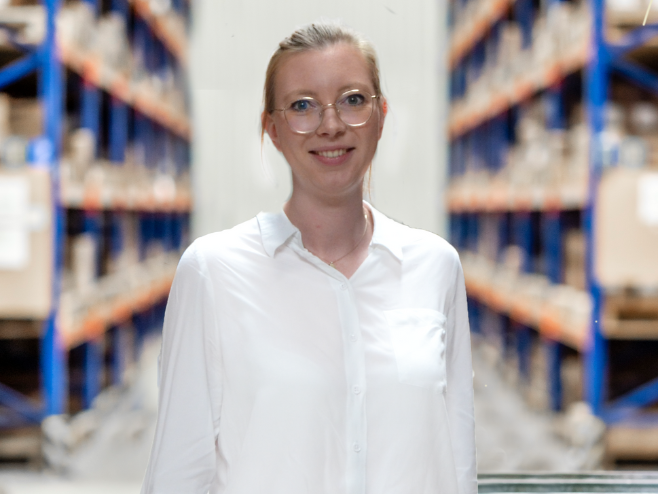 The dual student from RAMPA stands in front of boxes filled with inserts in the RAMPA warehouse.
