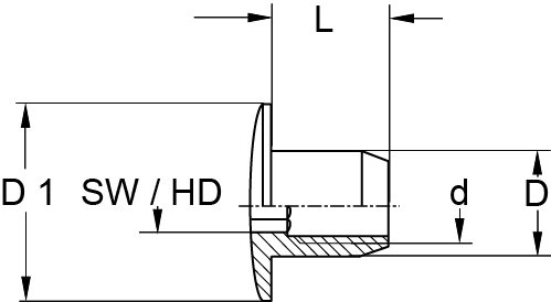 Écrous ronds RAMPA type RT avec six pans creux, trou de passage vers le filetage intérieur et tête bombée décorative pour les connexions visibles.