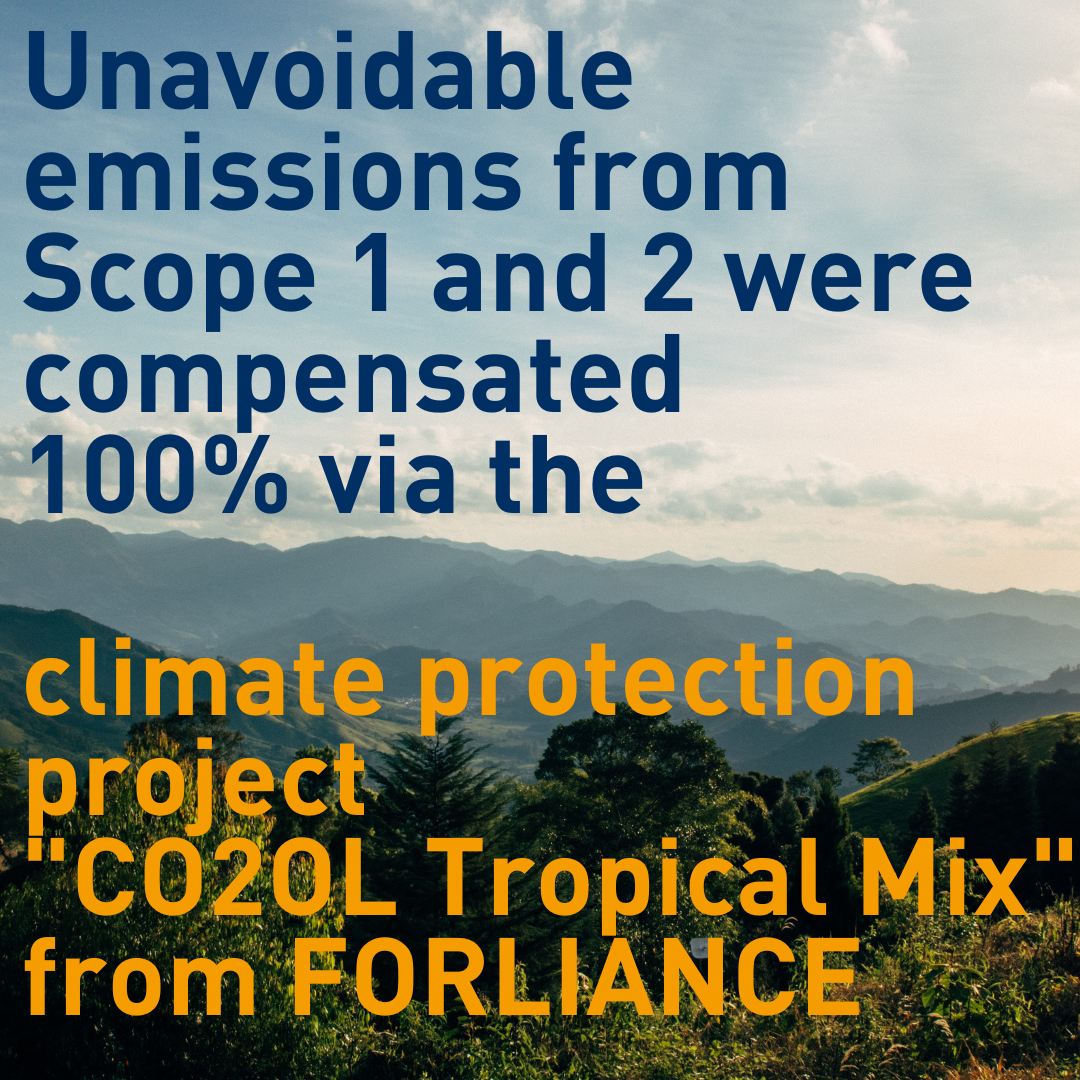 Pour les émissions que nous n'avons pas pu éviter, nous avons élaboré une stratégie de compensation : Nous avons décidé de compenser à 100 % les émissions de CO₂ causées dans les scopes 1 et 2 en investissant dans le projet de protection climatique "CO₂OL Tropical Mix" de FORLIANCE. À long terme, nous nous efforçons de réduire encore les émissions compensées.