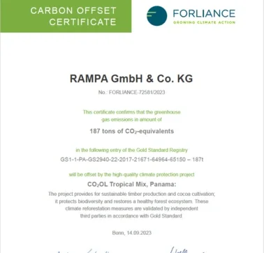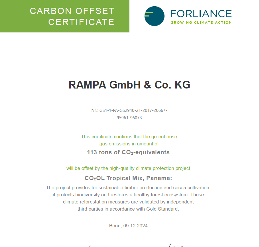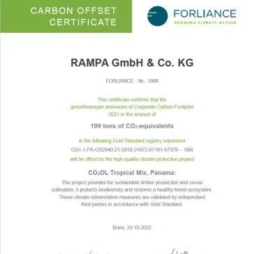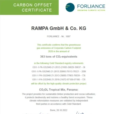 Afin de réduire et de compenser efficacement les émissions de CO₂* de RAMPA, nous faisons établir un bilan de notre empreinte carbone par notre partenaire expérimenté FORLIANCE sur la base du protocole des gaz à effet de serre (GHG Protocol du World Resources Institute et du World Business Council for Sustainable Development).
