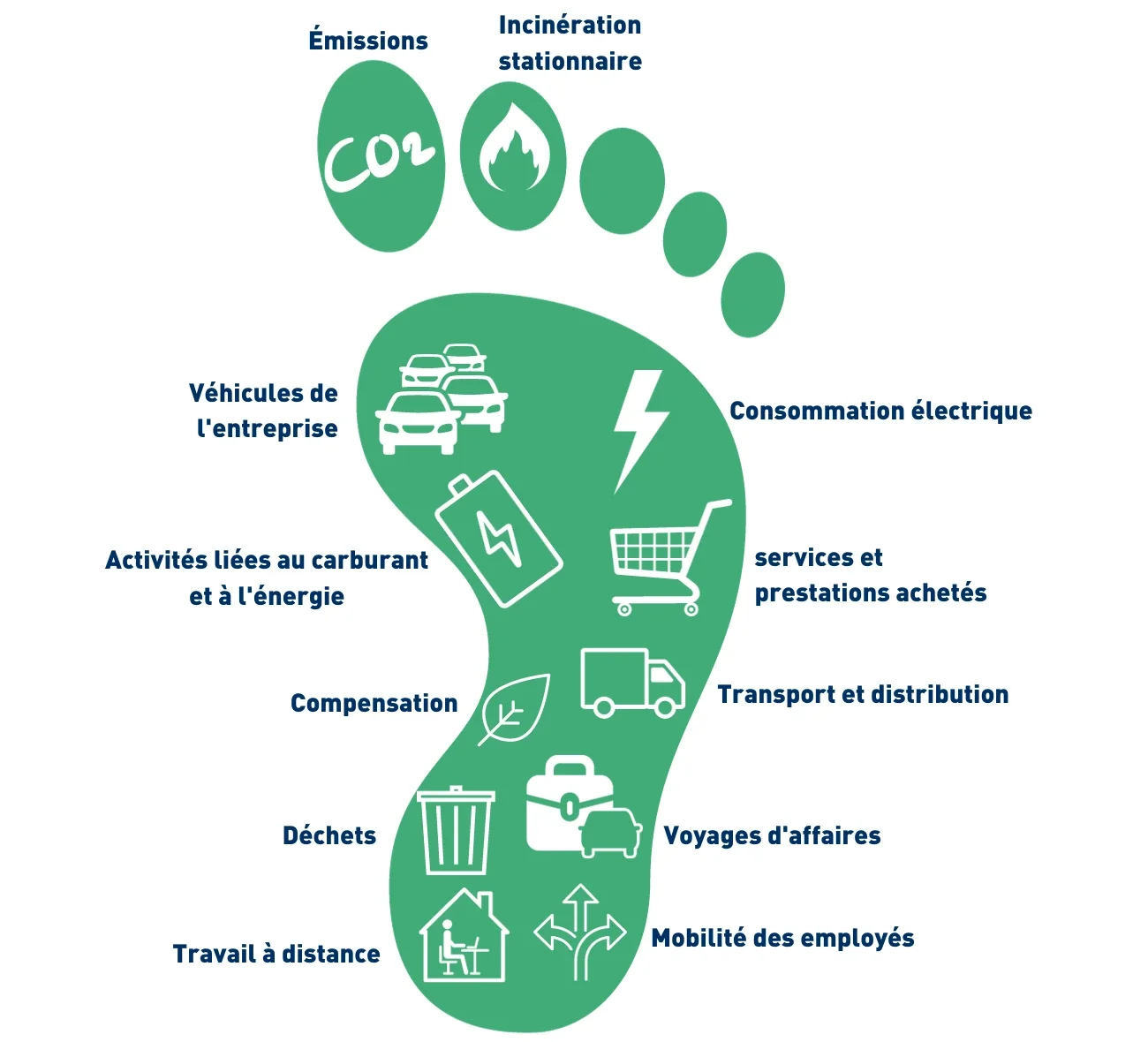 Scope 3: inclut toutes les autres émissions générées par les activités de l'entreprise mais détenues ou contrôlées par un tiers (par exemple, le transport, les biens et services achetés, les déchets, les voyages d'affaires/les déplacements domicile-travail, etc.).
