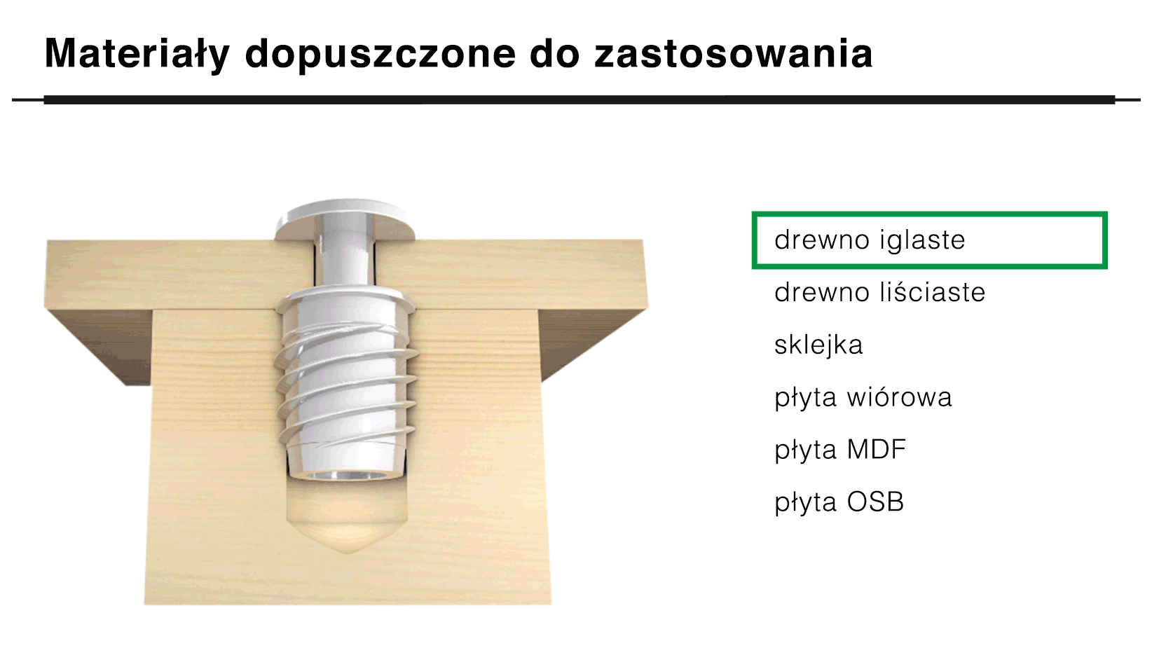 Pragniemy nieustannie się rozwijać, abyś dzięki temu mógł czerpać maksymalne korzyści! Dzięki rozszerzeniu naszej aprobaty ETA „ETA-12/0481 z dnia 22.03.2021 r." o kolejne właściwości, np. zmniejszone odstępy od krawędzi oraz skrócone długości montażowe, nasze nakrętki wkręcane do drewna z certyfikatem ETA nadają się do dodatkowych obszarów zastosowania. Dla Ciebie oznacza to zupełnie nowe możliwości! O ile wcześniej nasze wyroby z aprobatą ETA były dopuszczone do stosowania wyłącznie w drewnie iglastym, o tyle rozszerzenie aprobaty sprawiło, że nadają się nie tylko do drewna iglastego (np. świerk i sosna), lecz także do drewna liściastego (np. dąb i buk) oraz materiałów drewnopochodnych (np. płyty OSB, MDF, typu multiplex oraz płyty wiórowe).