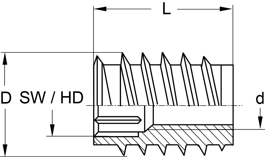 RAMPA inserts type SK330 with hex drive, unthreaded lead and patented 3-start external thread for tilt protection and quicker assembly. Highest possible pull-out values in various woods, wood-based materials and thermoplastics.